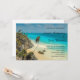 Wedding invitation with a beautiful photo featuring Tulum, Mexico. Turquoise waters on a sandy shore. Wind swept palm trees blowing in the breeze near a craggy cliff side. Soothing and relaxing.