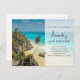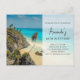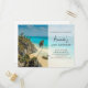 Birthday invitation postcard with a beautiful photo featuring Tulum, Mexico. Turquoise waters on a sandy shore. Wind swept palm trees blowing in the breeze near a craggy cliff side. Soothing and relaxing.