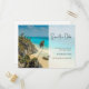 Save the date postcard with a beautiful photo featuring Tulum, Mexico. Turquoise waters on a sandy shore. Wind swept palm trees blowing in the breeze near a craggy cliff side. Soothing and relaxing.