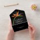 Elegant tropical bird of paradise flowers on a black background accent these tri-fold wedding invitations with your details in chic lettering in sections on the front and back and a detachable RSVP card for guests to complete and return. **REMEMBER to put a stamp on the RSVP card section. MATCHING items in our collection.