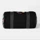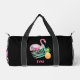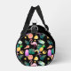 A toucan bird, a pink flamingo, and a bright pineapple combine with an ice cream cone, ice cream bars, a bright grapefruit slice, and a lemon, along with gold stars and green palm leaves to form a fun tropical pattern on this bag. The multi coloured, bright images are placed on a dramatic black background on each end. The front and back have images of the flamingo, a palm leaf, and pineapple. Your two letter monogram is in pink on the front. Bright, colourful and fun!