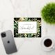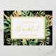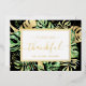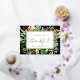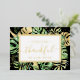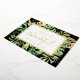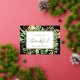 This modern tropical thank you card features green and gold palm, philodendron, and fern leaves on a black background. An elegant gold foil frame highlights the dark foiled text. Gold foil splatters accentuate this exotic botanical design and brings a bit of sophisticated whimsy to the invitation. The back can have a custom message printed on every card or can be left blank to allow for a handwritten message by the bride and groom.