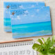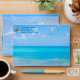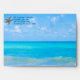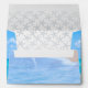 Envelopes decorated with tropical blue water image. A brown starfish, or sea star, on the front is next to the return address template. Text is printed blue and aligns to the top to use 3 or 4 lines as needed. The flap has some beach sand and inside is a starfish pattern. Use for any tropical or summer event.