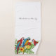 Tropical birds, parrots in blue, yellow and red sitting on green palm leaves. Decorated with tropical flowers. Elegant white background. Template for your family name, black hand lettered style script.