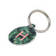 Tropical chic ID tag for your furbaby features a single initial monogram in vibrant beachy coral, on a pattern of green botanical jungle leaves on a black background. Personalise with your pet's name and your contact details on the reverse side.
