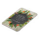 A wedding save the date magnet featuring a tropical botanical design with a chalkboard geometric design over a white brick background.