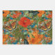 Three sheets of unique gift wrap in three designs with tropical leaves and flowers and a mash up of 3 animals with butterflies.