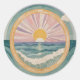 This vibrant, illustrative piece combines nautical scenery with mystical celestial symbols. At its center, a large circular window frames a tranquil sunrise or sunset over rolling ocean waves, rendered in a soothing palette of teal, seafoam, and lavender. Outside this frame, lush tropical foliage and palm fronds anchor the foreground, while the upper sky transition into a twilight scene featuring a golden crescent moon and shimmering stars. The artwork utilizes a mix of flat graphic shapes and soft watercolor textures, creating a peaceful, dreamlike coastal atmosphere that feels both modern and mythical.