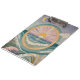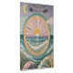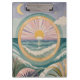 This vibrant, illustrative piece combines nautical scenery with mystical celestial symbols. At its center, a large circular window frames a tranquil sunrise or sunset over rolling ocean waves, rendered in a soothing palette of teal, seafoam, and lavender. Outside this frame, lush tropical foliage and palm fronds anchor the foreground, while the upper sky transition into a twilight scene featuring a golden crescent moon and shimmering stars. The artwork utilizes a mix of flat graphic shapes and soft watercolor textures, creating a peaceful, dreamlike coastal atmosphere that feels both modern and mythical.