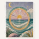 This vibrant, illustrative piece combines nautical scenery with mystical celestial symbols. At its center, a large circular window frames a tranquil sunrise or sunset over rolling ocean waves, rendered in a soothing palette of teal, seafoam, and lavender. Outside this frame, lush tropical foliage and palm fronds anchor the foreground, while the upper sky transition into a twilight scene featuring a golden crescent moon and shimmering stars. The artwork utilizes a mix of flat graphic shapes and soft watercolor textures, creating a peaceful, dreamlike coastal atmosphere that feels both modern and mythical.
