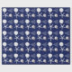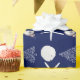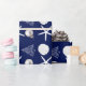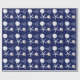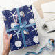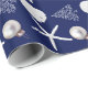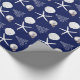 Dark navy blue with white, tropical themed Christmas gift wrapping paper on a roll. White sand dollars, starfish, Christmas tree art, and holiday ornament, is the pattern that covers paper with options.
