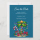 Save the date card with a seasonal holiday image. A tropical palm tree decorated in festive lights with a star on top. A giant red and white candy cane sticking out of the sand. Christmas presents under the tree. Whimsical and fun.