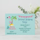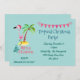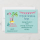 A tropical island themed Christmas party invitation. With a cute illustration of a pink flamingo in a red santa hat. Standing beside a green palm tree on a mound of yellow sand. A fancy swirly christmas tree design stands beside the text Merry Christmas. Written in the colour pink in a fancy handwritten font. A pink bunting banner at the top hangs over your festive party details. Pastel green background.