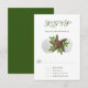 Tropical Christmas party reply cards with menu list, in green and white with starfish and sand dollar design. Holly leaves are tucked between a big sea star and white sand dollars in the centre of vertical white cards with green text. Reverse is solid dark green. Use for holiday office parties, or December weddings and big birthday celebrations.