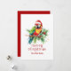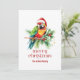 This festive tropical Christmas-themed design features- Merry Christmas -beautiful red retro typography with a tropical Christmas bird in a Santa hat.