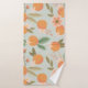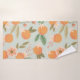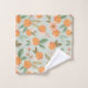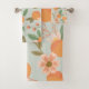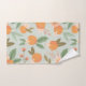 Add a finishing touch to your bathroom decor with this towel setl, featuring a colourful illustrated pattern of oranges, tropical flowers, and leaves on a light green background.