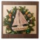 Christmas by the Sea! Add this stunning coastal-inspired Ceramic Tile to your tropical-themed holidays. The photo image on the Tile features a wreath adorned with starfish, various types of seashells, rattan balls, fruit, and a sailboat. The colour palette is soothing earth tones of brown and tan. The border is a rustic brown wooden wall. The text reads: "SEAS & Greetings" but may be edited for customisation at no additional charge. The Ceramic Tile may be used as a trivet, coaster, or display on an easel. Photography and design by Glenda Motsavage, a Florida-based travel writer and author. Image from Orlando Museum of Art, Festival of Trees.
