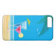 An illustration of a tropical cocktails in bright pink and blue on a beach background accented with palm leaves and seagulls, decorate this iPhone 7 Plus Case, reminding us of warm sunny vacations.