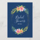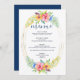 Bright tropical colours flowers bouquet with blue pink and yellow flowers accented with modern gold wire oval frame.