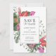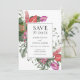 Tropical Wedding Save the Date featuring a border of colourful tropical flowers and greenery. Personalise with your information or click "Click to customise further" to edit font styles, size and colours. Add your photo on the backside. Matching items in the Tropical Collection in the Adore Paper Co. Zazzle shop.