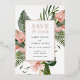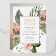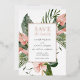 Foil pressed Wedding Save the Date for a tropical vibe. Featuring tropical pink flowers and lush greenery. Include your photo on the backside or delete and leave blank. Edit with your wording and select from three different foil colours including gold, silver and rose gold.