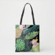 Beautiful vibrant watercolor tote bag design features palm fronds and a variety of fruity tropical drinks