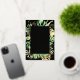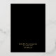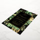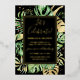 This elegant tropical elopement wedding celebration invitation features green and gold palm, philodendron, and fern leaves on a black background. An elegant gold foil frame highlights the gold foil text. Gold foil splatters accentuate this exotic botanical design and brings a bit of modern whimsy to the invitation. "Let's Celebrate!" along with the newlyweds' names are featured at the top. The wedding vow details and reception details are underneath. RSVP information is on the back of the invitation.