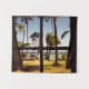 Tropical Fiji Beach Scene - Photograph of a beach in the Fiji Islands with palm trees, hammocks and a picnic bench seen through the open shutters of a beach hut.