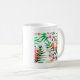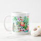 A tropical theme artwork of a pink flamingo and green tropical jungle plants with hibiscus flowers and palms against a neutral white background. A fun and colourful art piece.