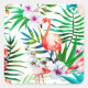 A tropical theme artwork of a pink flamingo and green tropical jungle plants with hibiscus flowers and palms against a neutral white background. A fun and colourful art piece.
