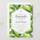 The bachelorette weekend invitation design features a modern tropical theme with banana leaves watercolor illustration with a geometric frame, a small flamingo, an elegant hand-written calligraphy guest of honour to make it stand out, the rest of the information is presented in classic serif typography, the design is finished on the reverse with the weekend event itinerary. Personalise with your information using the template fields provided.