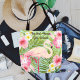 Gather the crew for a tropical getaway with this eye-catching tote featuring a pink flamingo surrounded by lush hibiscus, plumeria, and palm fronds in a vibrant allover pattern. A personalized location and event name in playful script make it a one-of-a-kind souvenir for a girls weekend, bachelorette trip, or beach vacation. Location and event text are fully customizable.