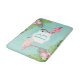 A vibrant tropical bath mat featuring two pink flamingos, lush palm fronds, and pink hibiscus and plumeria blooms surrounding a custom monogram initial in an elegant frame. The cheerful robin egg blue background brings a fresh, island-inspired feel to any bathroom. A beautiful accent for beach houses, vacation homes, or tropical-themed bathrooms. The initial is fully customisable.