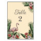This elegant tropical table number card features hand-drawn tropical flamingo themed illustrations in black ink, showcasing pink flamingos, hibiscus and jasmine flowers, a pineapple and tropical leaves, all against an elegant yellow background. Printed on both sides.