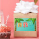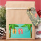 A whimsical design with flip flops on clothesline hanging between two palm trees on blue background. Coordinating items available. Some graphics by freepik.com