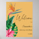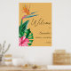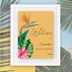 Design features an watercolor elegant bouquet of classic beach watercolor greenery and flowers, including blush pink hibiscus, orange and blue bird of paradise, green greenery and dark green palm leaf.