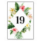 Tropical Floral Diamond Frame Table Numbers. Customisable floral table numbers featuring watercolor illustrations of hibiscus, plumeria, orchids, palm leaves, banana leaves and split leaf philodendron. Personalise each table number. These tropical table numbers are perfect for summer, beach and tropical weddings, birthdays and other events.