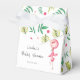 Adorable tropical flamingo baby shower favour box with pink and green colours. Use it in your baby shower to include with your favours. Personalise the text with your own information. Illustrated and designed by Patricia Alvarez.