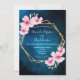 An elegant tropical summer wedding invitation. With a faux gold geometric frame decorated with light pink hibiscus, flowers tropical florals with some greenery. A dark tropical night sky as background.