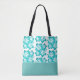 This tote bag is shown with a cute tropical flowers print design in a in the tropical Blue-Green colours on a white background colour with a Aqua coloured accent strip at the bottom.