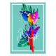 This colourful design features tropical plants, flowers, and a multicolored parrot.