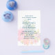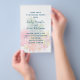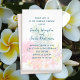 Budget wedding invitation template with a tropical background design. White paper with dark blue text to customise in three sections. Pineapples and exotic, tropical flowers decorate the background in green, pink, orange and yellow. All the favourites of the tropics are included such as plumeria flowers, hibiscus, and bird-of-paradise. The invitation comes in three sizes. Transfer the design to any paper upgrade if you prefer.