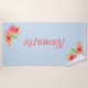 Pretty yoga themed beach towel done in light blue, with graphics of colourful tropical flowers. Coral coloured text reads Namaste and can be personalised to read what you want.