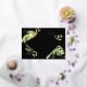 This elegant tropical wedding invitation features green and gold philodendron and fern leaves behind a gold foil geometric frame on a black background. Foil splatters around the outer edges accentuate the exotic botanical design. This sophisticated oasis style invite is perfect for any outdoor, island or destination wedding.