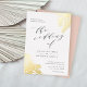 Invite guests to your summer, destination or beach wedding with these tropical chic wedding invitations featuring tropical palm frond leaves in elegant gold foil. Your wedding details appear in a mix of calligraphy script, serif, and italic typography. Cards reverse to solid blush pink for a chic tropical look.