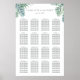 Tropical chic wedding seating chart features tropical palm frond leaves in green watercolor. Space provided for 16 tables of 10 or 160 guests.