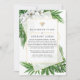 Green and gold geometric tropical reduced wedding guest list announcement with white magnolias. In these uncertain times, it can happen that you may have to hold a smaller wedding than originally planned. This announcement card will take away the awkwardness and take a load off your mind! You can furthermore provide an option to join you for a virtual ceremony.