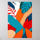 A stunning digital artwork blending abstract tropical leaves, vibrant reds, oranges, and blues with geometric precision for a modern minimalist aesthetic.
