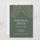 Modern and elegant rehearsal dinner invitation template card featuring gilded hand drawn tropical greenery of banana leaves. The lines of the palm leaves are in faux gold glitter. The background is green. Customise this product by adding your own wedding information. Great for destination or beach wedding in the summer.