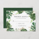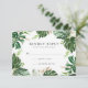 Elegant tropical wedding RSVP cards featuring your wedding details surrounded by a border of watercolor monstera leaves and faux gold foil and green foliage. The wedding response cards reverse to a solid tropical background. Designed to coordinate with our Tropical Gold wedding collection.